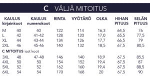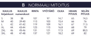 - mitoitukset: B – normaali ja C – väljä, lyhennetty helman pituus