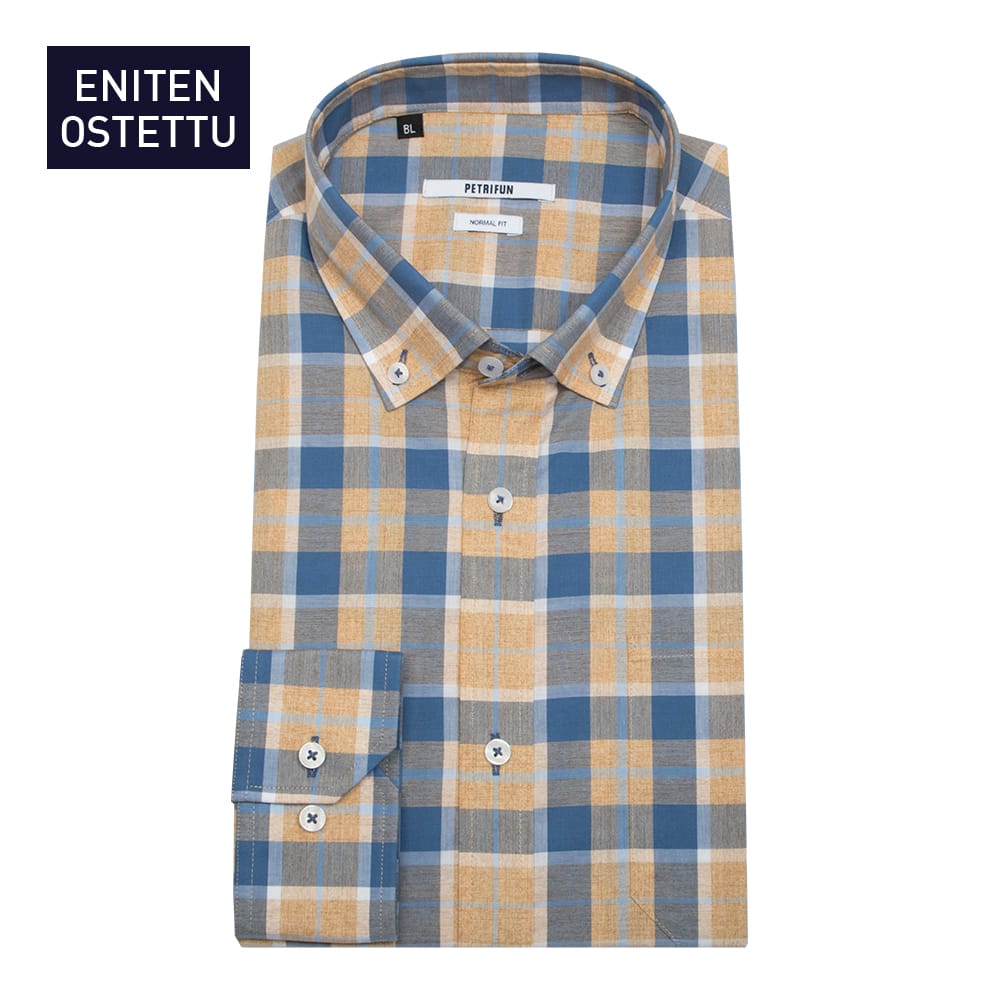 Tämä monivärinen nappikauluspaita on helppo yhdistää eri väristen chinojen tai farkkujen kanssa ja sen voi pukea neuleen tai bleiserin alle. Paitaa on saatavilla kahdessa mitoituksessa: B – normaali (normal fit) ja C – väljä (classic fit). Käytännöllisyyttä paitaan tuo rintasku. Säädettävä rannekenapitus tuo käyttömukavuutta ja napit pysyvät varmasti kiinni, paidoissamme on Ascolite nappitakuu. Tyyllikkäässä paidassa on hieman lyhyempi helman pituus, jolloin paidan helman voi jättää rennosti housujen päälle.