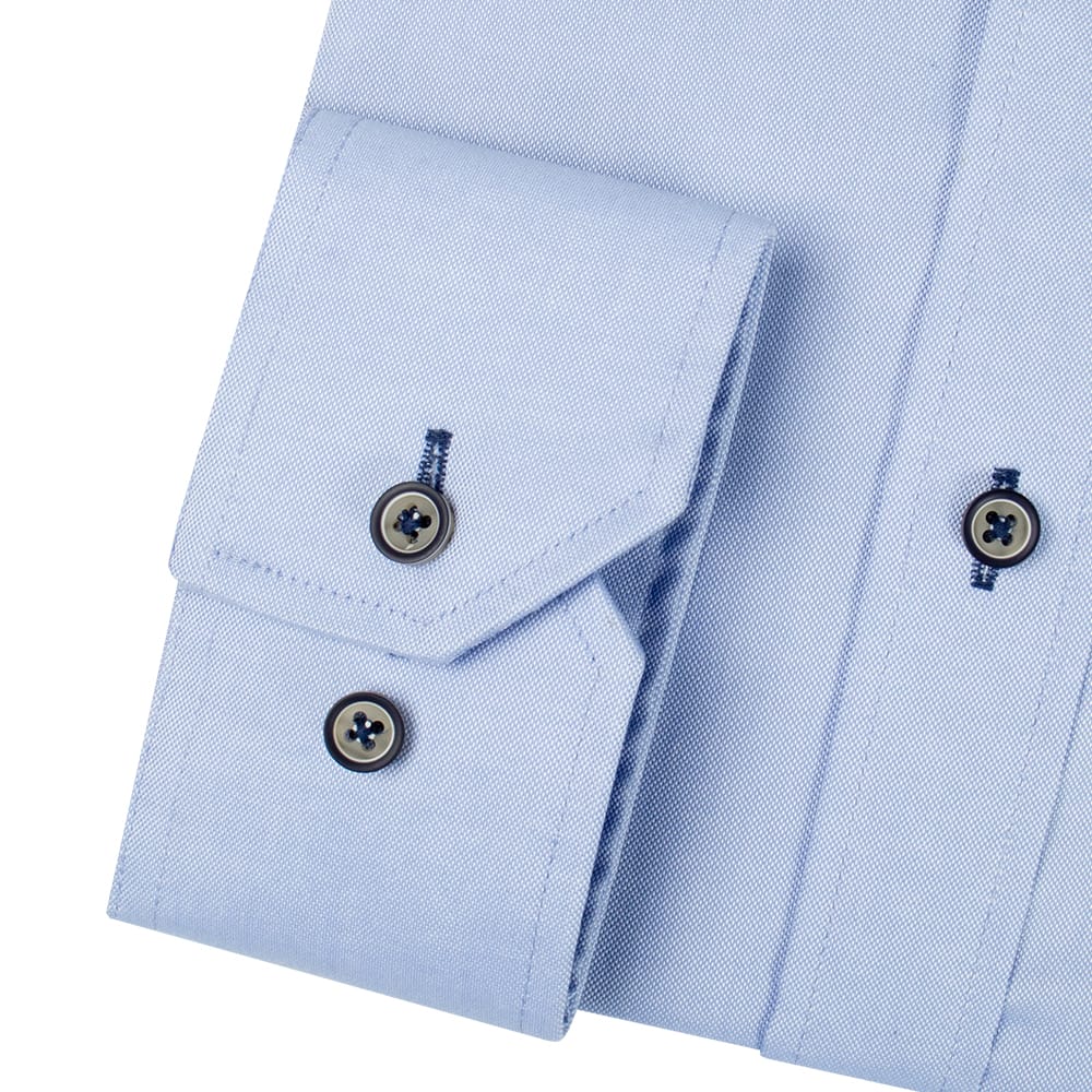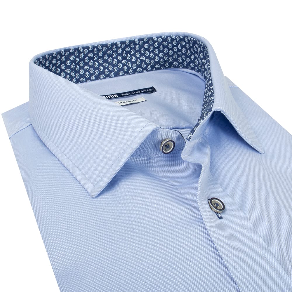 Ajaton vaaleasininen kauluspaita on vaatekaapin luottopaita, joka toimii tilanteessa kuin tilanteessa. Sopii erinomaisesti työpukeutumiseen, juhliin ja vapaa-ajalle. Paidan kauluksen sisäpuoli on kuviollista printtikangasta ja tummasininset kontrastinapit viimeistelevät ilmeen. Paidan materiaali on laadukasta 100% puuvillaa, Wash, Hang & Wear viimeistely takaa, että paita on silittämättä siisti. Paidan hiha- ja sivusaumat on teipattu. Teipatut saumat pysyvät siisteinä pesun jälkeen, eikä niitä tarvitse silittää. Tästä paidasta löytyy varmasti jokaiselle oikea koko, koska saatavilla neljä eri mitoitusta: A – kapea, B – normaali, erikoispitkä B – normaali ja C – väljä.